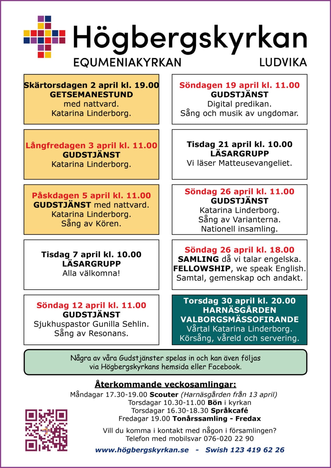Församlingens vision: Högbergskyrkans församling växer i gemenskap med Jesus Kristus, varandra och världen.